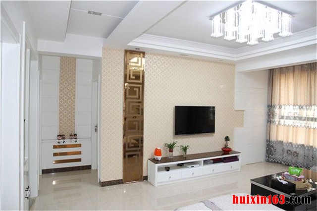 客厅内吊顶使用的装修材料是白色的石膏板,上面安装的是一个吸顶的水晶吊灯,造型华丽大气,给空间内带来了明亮的感觉,吊灯的下面就是一些沙发和茶几,沙发选择的颜色也是偏白色的,上面蓬松的坐垫给人最舒适的享受,中间黑色的茶几让房间内有了活跃的氛围。在沙发的对面是一个电视,电视安装在墙面上,墙面的中间,使用的是素雅的壁纸装饰的,上面的小碎花也是比较的漂亮,在墙面的一侧有一个景色的板块,上面的图案高雅大气。房间内的地面使用的是瓷砖装饰的,洁净亮白,营造了一个良好的休息环境。