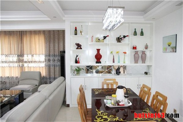 客厅内吊顶使用的装修材料是白色的石膏板,上面安装的是一个吸顶的水晶吊灯,造型华丽大气,给空间内带来了明亮的感觉,吊灯的下面就是一些沙发和茶几,沙发选择的颜色也是偏白色的,上面蓬松的坐垫给人最舒适的享受,中间黑色的茶几让房间内有了活跃的氛围。在沙发的对面是一个电视,电视安装在墙面上,墙面的中间,使用的是素雅的壁纸装饰的,上面的小碎花也是比较的漂亮,在墙面的一侧有一个景色的板块,上面的图案高雅大气。房间内的地面使用的是瓷砖装饰的,洁净亮白,营造了一个良好的休息环境。