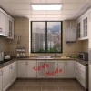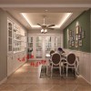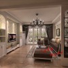 客厅内吊顶使用的装修材料是石膏板,白色的石膏板给人纯净的感觉,在吊顶的中间安装的是一个水晶吊灯,黑色增加了时尚的感觉,晶莹的水晶更是让房间内变得灿烂。在吊灯的下面就是沙发和茶几,沙发使用的是暖色的布料沙发,灯光的陪衬下,更加的温馨,旁边白色的边框增加了室内高雅的感觉,蓬松的坐垫更是给人最舒适的享受。沙发的中间放置的是一个白色的边框和棕色台面的茶几,下面的地毯更是有田园的色彩。在沙发的后面墙面中间的地方使用的是壁纸装饰的,颜色素雅大气,上面的小碎花也是非常的清新的。沙发的对面是一个电视,电视做了背景设计,中间的地方是素雅的壁纸,两侧是圆拱形的设计,非常的漂亮。复古瓷砖的装饰地面,给人营造了温馨安逸的休息环境。