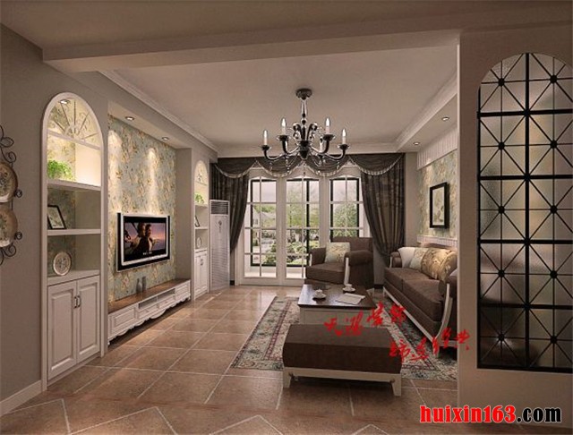 客厅内吊顶使用的装修材料是石膏板,白色的石膏板给人纯净的感觉,在吊顶的中间安装的是一个水晶吊灯,黑色增加了时尚的感觉,晶莹的水晶更是让房间内变得灿烂。在吊灯的下面就是沙发和茶几,沙发使用的是暖色的布料沙发,灯光的陪衬下,更加的温馨,旁边白色的边框增加了室内高雅的感觉,蓬松的坐垫更是给人最舒适的享受。沙发的中间放置的是一个白色的边框和棕色台面的茶几,下面的地毯更是有田园的色彩。在沙发的后面墙面中间的地方使用的是壁纸装饰的,颜色素雅大气,上面的小碎花也是非常的清新的。沙发的对面是一个电视,电视做了背景设计,中间的地方是素雅的壁纸,两侧是圆拱形的设计,非常的漂亮。复古瓷砖的装饰地面,给人营造了温馨安逸的休息环境。