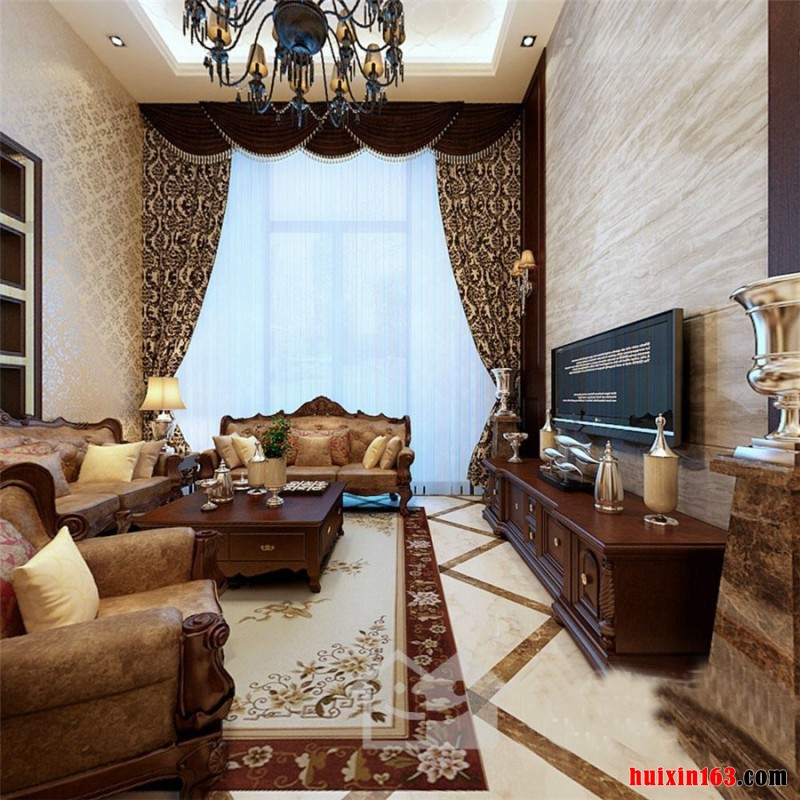 客厅内的吊顶使用的装修材料是石膏板,白色的石膏板为室内增加了明亮的感觉,在吊顶的中间放的是一个造型华丽的水晶灯,灯的颜色偏深,放射的灯光也是比较的柔和的,在吊灯的下面摆放的是一个实木的茶几和一圈沙发,实木的茶几放在沙发的和中间,更加有自然的味道,沙发使用的是皮质的料子,非常的高雅,上面的小印花也是非常的清新淡雅的。在沙发的框架上使用的是实木做成的,上面的小型浮雕也是形象生动。在沙发的后面是一个使用壁纸装饰的墙面,对面是电视,电视安装在一个大理石装饰的背景墙上,清新素雅,两侧的实木条更有支撑保护的意思。
